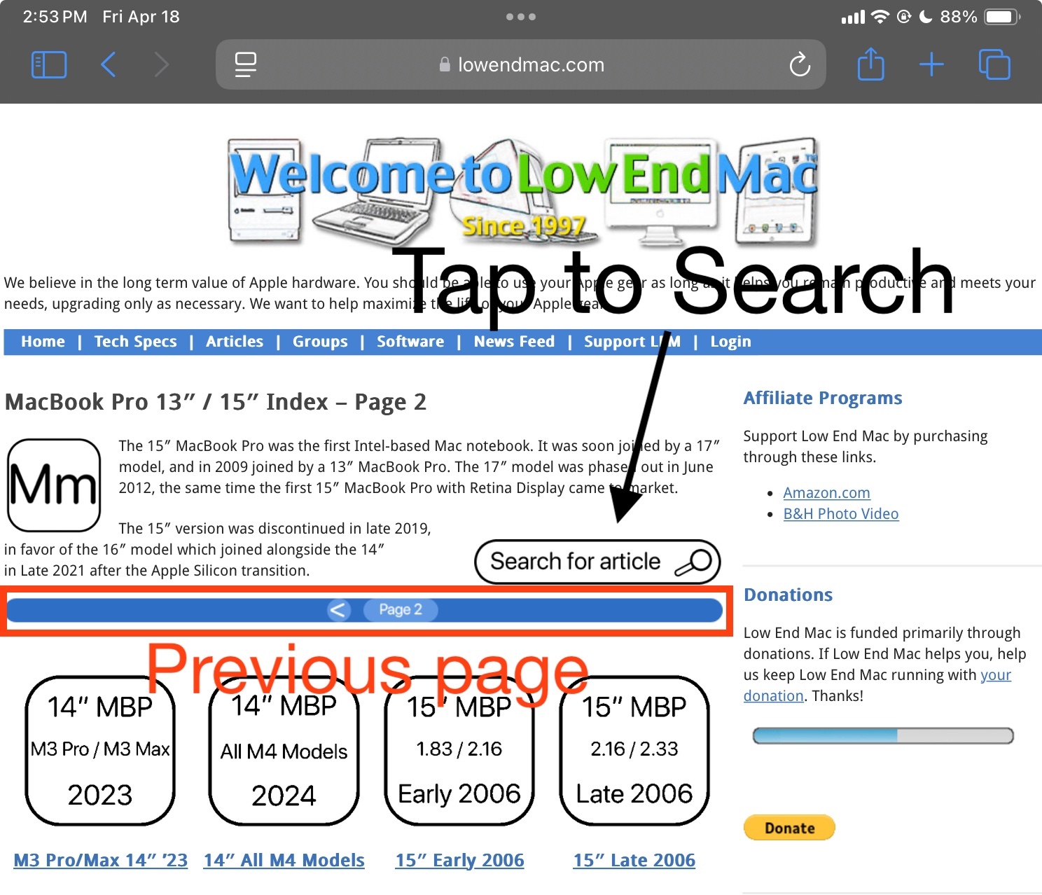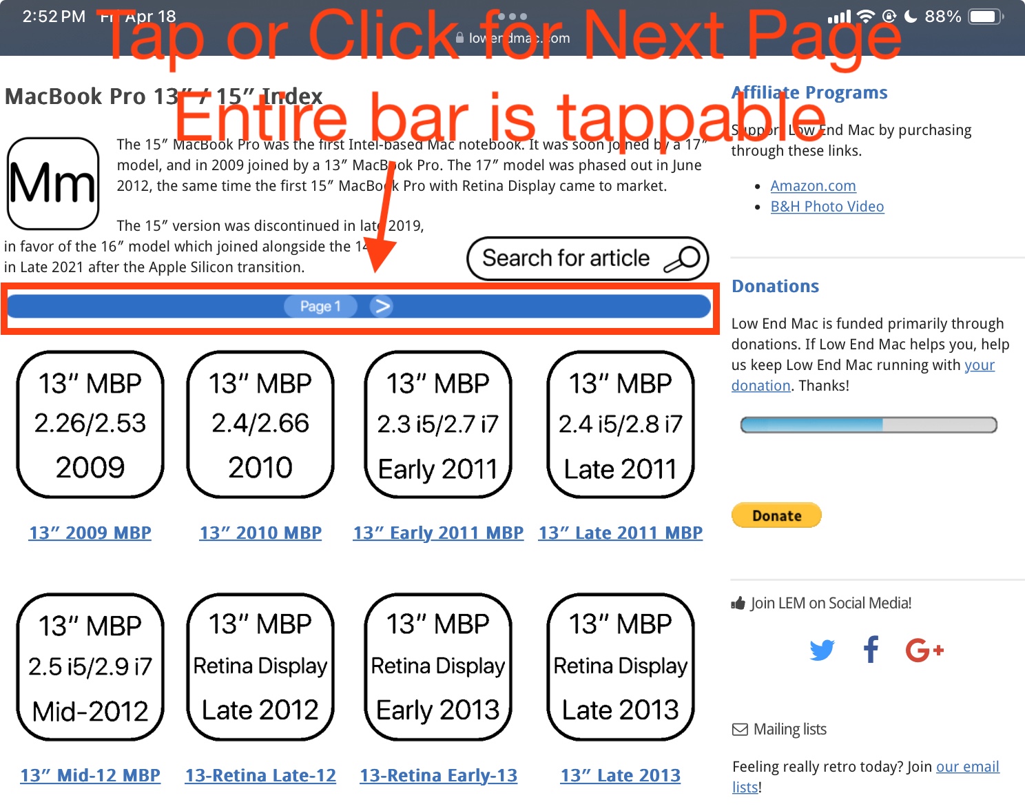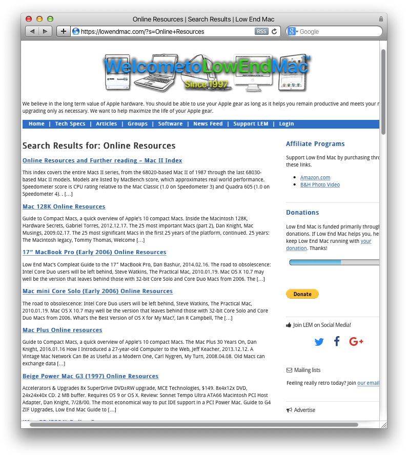 . - 8: Careful consideration was thought out to make sure navigation and design elements were as consistent as could be. There was consideration to make sure all tech spec pages have the same buttons in the same places, so muscle memory is consistent. The hyperlink structure was preserved so if you’re used to navigating Low End Mac the old way, the buttons are all in the same place but now there’s more of them and there’s labels.