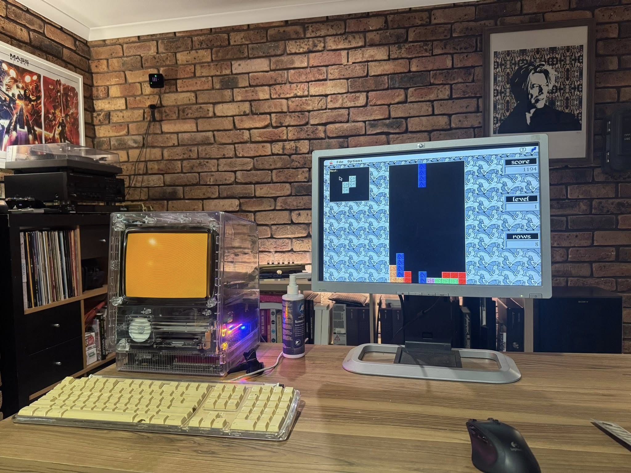 Timothy de Denaro is a longtime tinkerer of Macs from our LEM FaceBook and put together one of the most decked-out and modified Macintosh SE 30s ever! Housed wholly in a clear case, wielding two monitors (an external one of course), and.. it even has a USB port..?!