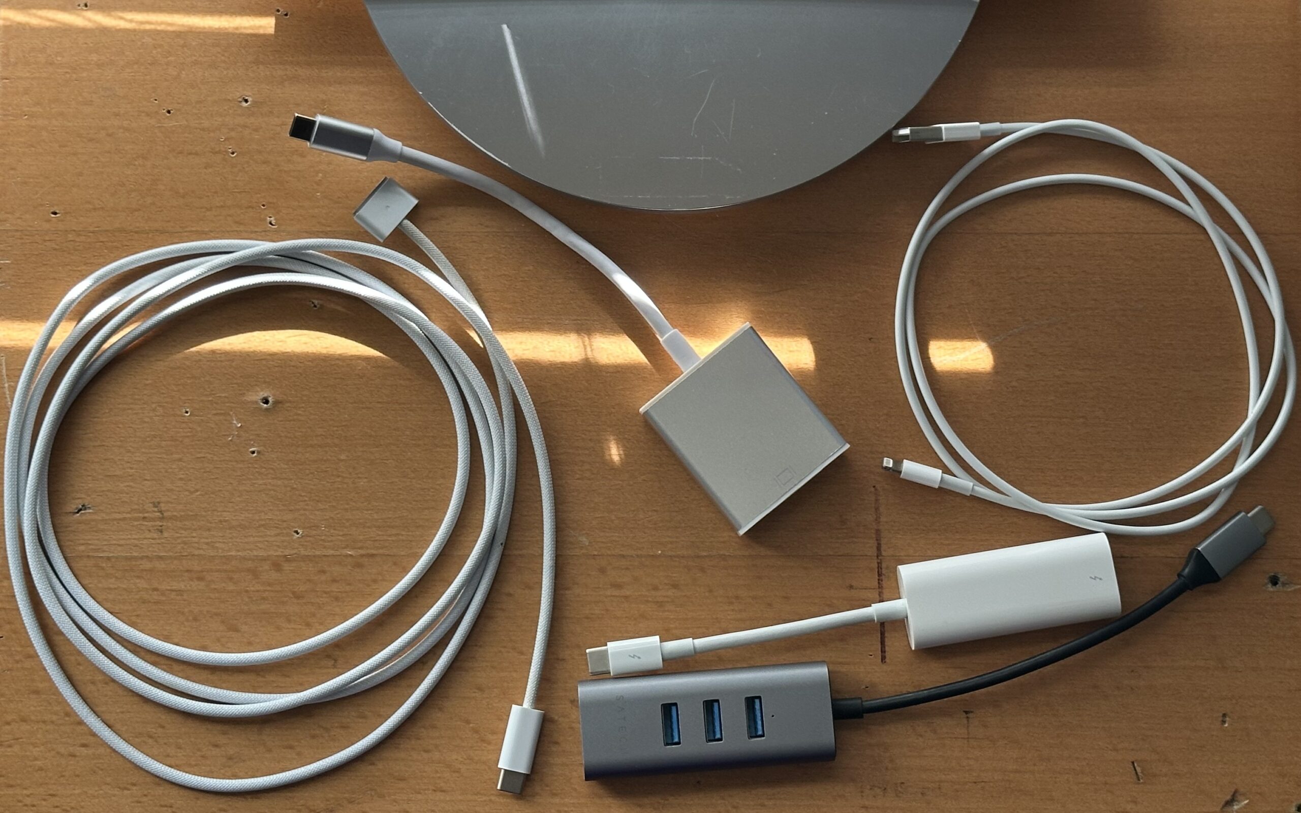3: A TB3 to TB2 adapter, Gigabyte Gaming Box, and USB-C to DVI Adapter
