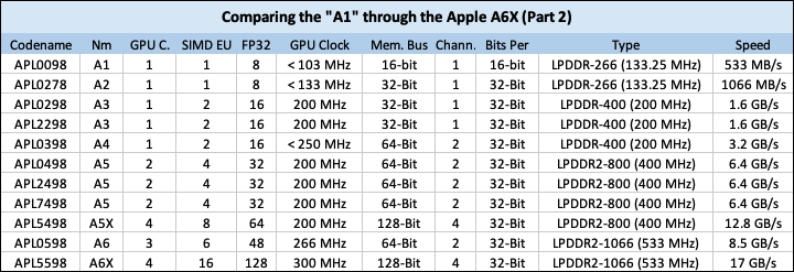 Finally the chips are creeping over that 1 GHz CPU clock speed threshold, seeing 1.3 GHz in the iPhone 5/5c, and 1.4 GHz in the 4th Generation iPad with an A6X. The type of RAM is also upgraded over the A5 series, now using LPDDR2-1066 (533 MHz) at 8.5 GB/s memory bandwidth, and 17 GB/s for the iPad 4th-gen. GPU clock is also slightly higher on the 4th-Gen iPad, at 300 MHz vs 266 MHz on the iPhone 5/5c.
