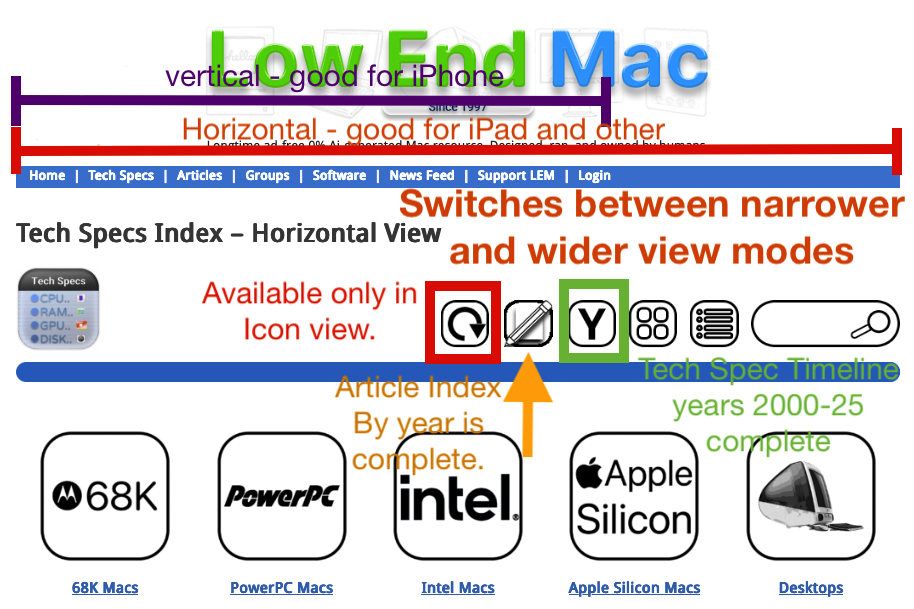 Since Early 2025, Low End Mac has dramatically transformed its navigational UI and functionality, evolving along with the site’s design which has been around since 2016. This is no accident – by making sure the site stays “low-resource”, it ensures devices of many generations can reasonably load this website with their own web browser.