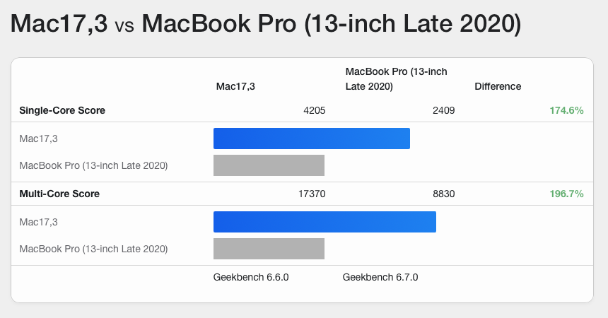 - See: Mac17,3 vs MacBook Pro (13-inch Late 2020) – Geekbench Browser