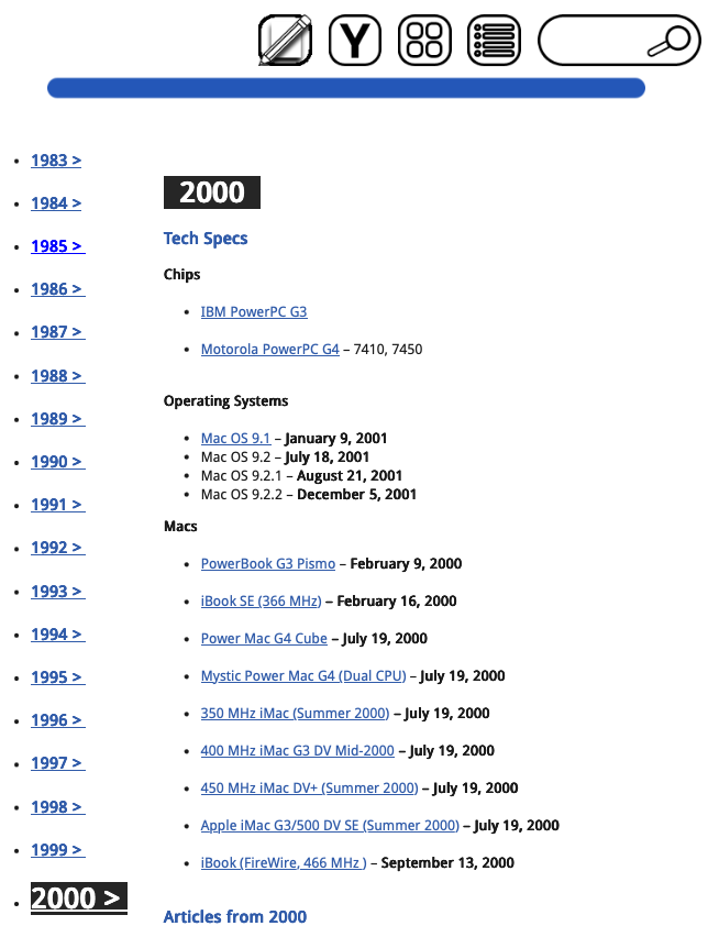 The new mysterious “Y” button in the icon row of every page points to a new feature of our website, which is a timeline view for our website’s tech specs index in particular. Our readers now have three ways to navigate the articles on our website:
