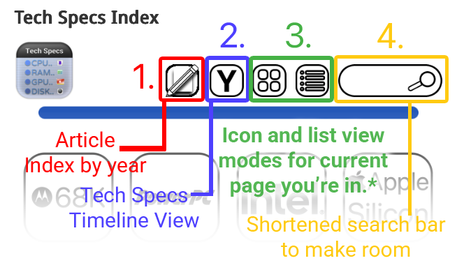 . - If you’re anywhere on the Tech Specs Timeline View or are in the Article Index, those two buttons will instead return you to the classic Tech Specs index page, in either Icon view or Text/list view of your choice. This should add to navigational consistency and make it easier to navigate out of Tech Specs Timeline View or the Article Index.