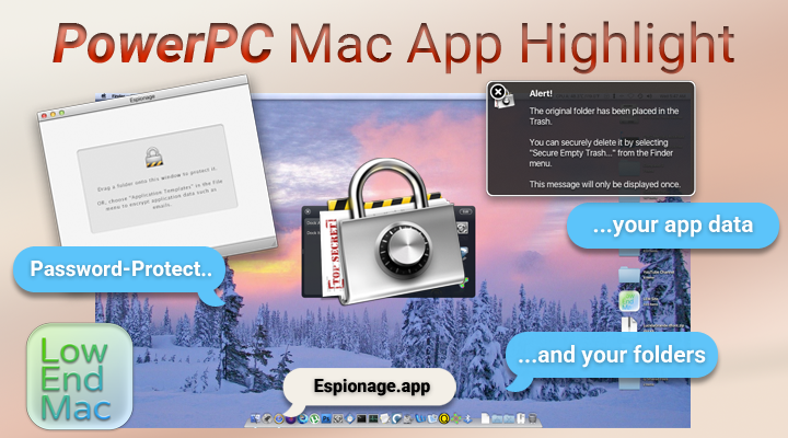 So you have a password to protect your user account, but how about passwords to protect your folders and app data as well? Here’s a neat lil’ app for PowerPC Macs called Espionage – simply Drag-N’Drop a dollar to the window, or add app data from the “+” in the main window once you setup your password.