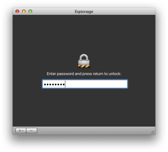 - You will be prompted to setup a new password initially, upon the first time opening the app. This is so you can lock/unlock the Espionage app. Once you have it setup, this is the password you will use every time the app is launched (after logging in or quitting).
