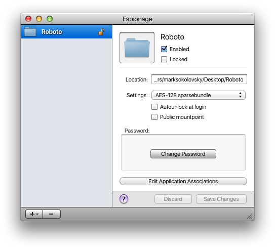 It’s a relatively straightforward app in that aspect. It makes an AES 128-Bit Encrypted .sparsebundle image out of the original, tosses the old folder in the trash, and puts a shortcut in place of the original icon.