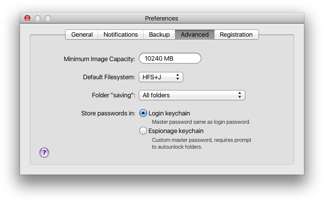 - Change minimum image capacity, default file system, dollar “saving”, encryption type, and where passwords are stored (login keychain vs Espionage’s own keychain)