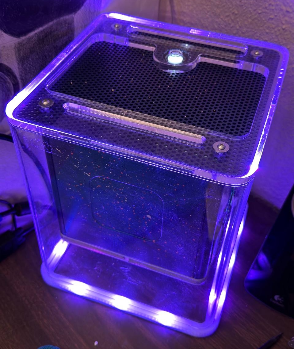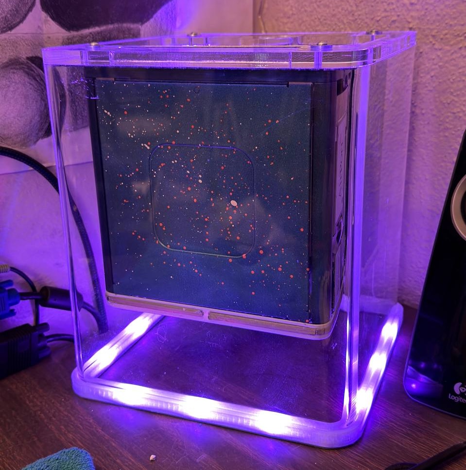 Said friend on Discord has his own cube that was given a trippy custom paint job, and, well, I was inspired, and given the PowerLogix chassis displays the innards of the Cube (and mine were kinda banged up) I decided to use some color shifting paint and make this Cube truly my own. And this is the final result.