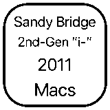 Intel CPUs in Macs – Index These links provide a quick way to access CPU specs for Intel-specific chips used on Macs. Amber Lake-Y Arrandale (1st) Bloomfield Xeon Broadwell (5th) Cascade Lake Xeon Clarkdake (1st) Clovertown Xeon Coffee Lake Comet Lake (10th) Crystal Well ’13 Gainestown Xeon Gulftown Xeon Harpertown Haswell 4th-Gen Ice Lake 10th-Gen Ivy Bridge (3rd) Kaby Lake (7th) Lynnfield 1st-Gen Merom Core 2 Penryn Core 2 Prescott, DTK1 Sandy Bridge Skylake 6th-Gen See as a list Share this: Click to share on Bluesky (Opens in new window) Bluesky Tweet Click to email a link to a friend (Opens in new window) Email Click to print (Opens in new window) Print MorePocketShare on Tumblr Click to share on Reddit (Opens in new window) Reddit Like this:Like Loading...