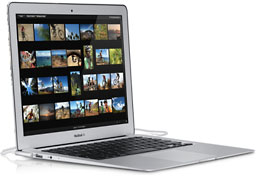 As before, the MacBook Air is available in 11" and 13" models with an aluminum unibody enclosure measures 0.11" at its thinnest point and 0.68" at its thickest. Standard flash storage allows the slim notebook to turn on virtually instantly and deliver fast data access, improved reliability and better energy efficiency. The 11" model weighs 2.38 pounds and provides up to a claimed 5 hours of battery life, while the 13" weighs 2.96 pounds and provides up to 7 hours of battery life.2