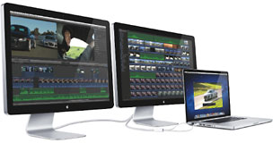 With a beautiful 16:9 edge-to-edge glass design, the Thunderbolt Display uses IPS technology to provide a brilliant image across an ultra wide 178° viewing angle. Any Thunderbolt-enabled Mac notebook can dock with the display to quickly and easily create a full-fledged desktop solution. The Thunderbolt Display includes a built-in FaceTime HD video camera for crisp video conferencing, a 2.1 speaker system for high quality audio, an integrated MagSafe charger to keep Mac notebooks charged, three USB 2.0 ports, one FireWire 800 port, one Gigabit Ethernet port, and a Thunderbolt port for daisy chaining up to five additional Thunderbolt devices.