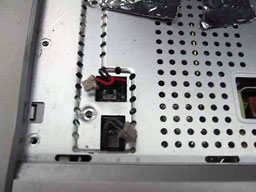 These two connectors handle the power to the on/off switch above thekeyboard and the lead from the speakers to the mainboard. Yes, this isthe garflax! Proceed with caution from this point on: If you ruin theconnector on the board, you will render the computer useless. (I know,you could buy a new mainboard, but really, that costs money!) Do notpull on the leads going into the connector. Be very, very afraid.