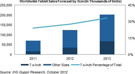 Provisionally, IHS iSuppli says the 7" size range should account for 28% of all tablets in 2012, up from 24% in 2011. In 2013, the 7.x" share will rise to 33%, regarding its 2013 forecast for 7.x" tablet sales as conservative, with some factors potentially boosting the market to higher levels for the year.